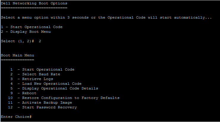 4. เมื่อหน้าจอปรากฏข้อความ Dell Networking Boot Options ให้พิมพ์ "2" และกด "Enter" ภายใน 3 วินาทีเพื่อเลือก หากพลาดขั้นตอนนี้ คุณจะต้อง ปิด-เปิด สวิตช์ใหม่อีกครั้ง
