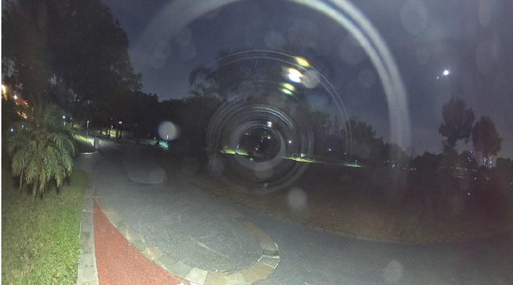 - มีแสงจากแหล่งกำเนิดแสงในระยะใกล้ส่องกระทบฝาครอบโดมในมุมเฉียง ส่งผลให้เกิดแสงจ้าอย่างรุนแรง จนปรากฏเป็นแสงฟุ้งหรือปื้นแสงกระจายรบกวนทั่วทั้งภาพ